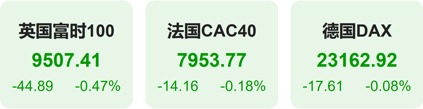 欧洲股市方面,英国富时100指数小幅下跌0.47%,报9507点。法国CAC40指数小幅下跌0.18%,报7954点。德国DAX指数小幅下跌0.08%,报23163点。