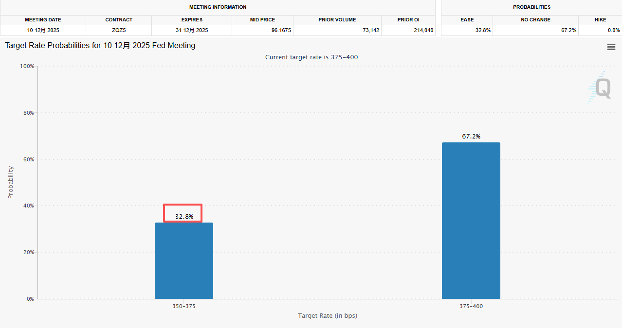 同时,美国劳工统计局(BLS)表示,将不会发布10月非农就业报告,而是把相关的就业数据纳入11月报告。11月非农就业报告将于12月16日发布,比原计划晚了一个多星期,并且是在美联储今年最后一次会议之后公布。消息公布后,投资者认为美联储在12月降息的可能性降低,因为官方数据延迟可能使决策者在前景上更加分歧。债券交易员几乎放弃了对12月降息的押注。CME美联储观察工具显示,12月降息概率已跌至33%,昨日还接近50%。