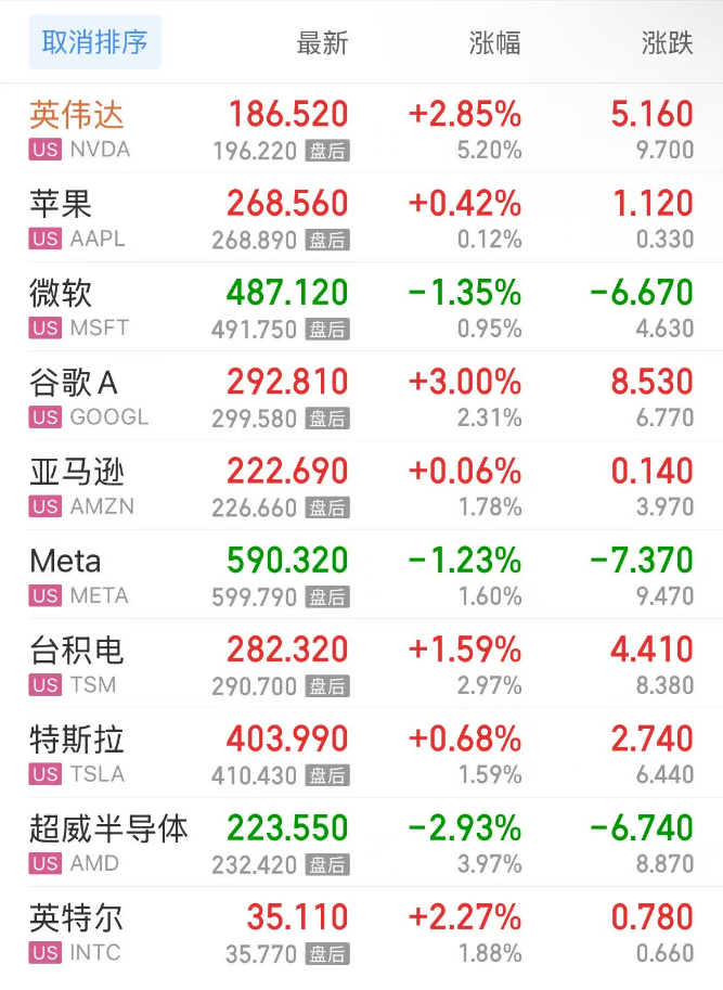 热门美股中,英伟达涨2.85%,苹果涨0.42%,微软跌1.35%,谷歌C涨2.82%,谷歌A涨3.00%,亚马逊涨0.06%,Meta跌1.23%,台积电涨1.59%,特斯拉涨0.68%,超威半导体跌2.93%,英特尔涨2.27%。
