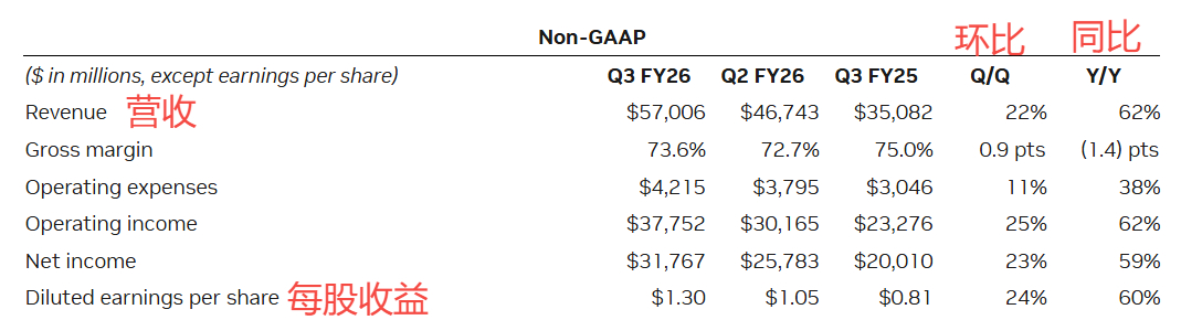 具体来看,三季度营业收入570.1亿美元,同比增长约62%,分析师预期551.9亿美元,英伟达自身指引529.2亿至550.8亿美元;三季度非GAAP口径下调整后的每股收益(EPS)为1.30美元,同比增长60%,分析师预期1.26美元。:三季度调整后毛利率为73.6%,同比下降1.4个百分点,分析师预期74.0%,英伟达指引为73%至74%。