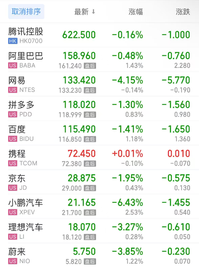 热门中概股方面,腾讯控股(港股)跌0.16%,阿里巴巴跌0.48%,拼多多跌1.31%,网易跌4.15%,携程涨0.01%,百度跌1.41%,小鹏汽车跌6.43%,理想汽车跌3.27%,蔚来跌3.85%。