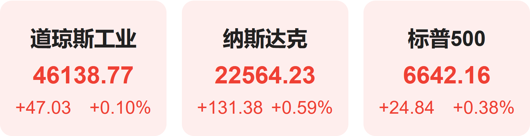 截至收盘,标普500指数涨0.38%,报6642.16点;道琼斯指数涨0.10%,报46138.77点;纳斯达克指数涨0.59%,报22564.23点。