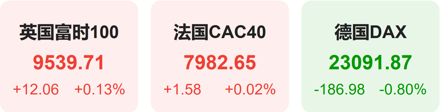 上周五,欧洲股市方面,英国富时100指数小幅上涨0.13%,报9540点。法国CAC40指数小幅上涨0.02%,报7983点。德国DAX指数小幅下跌0.80%,报23092点。