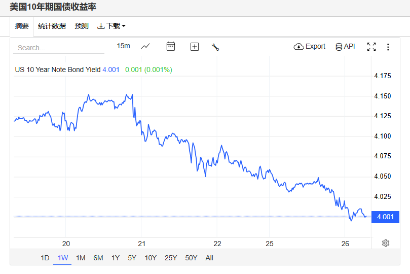 美债收益率延续跌势,基准的10年期美债收益自10月下旬以来首次跌破4%,最终收报4.001%,对美联储政策利率敏感的2年期美债收益率收报3.463%。
