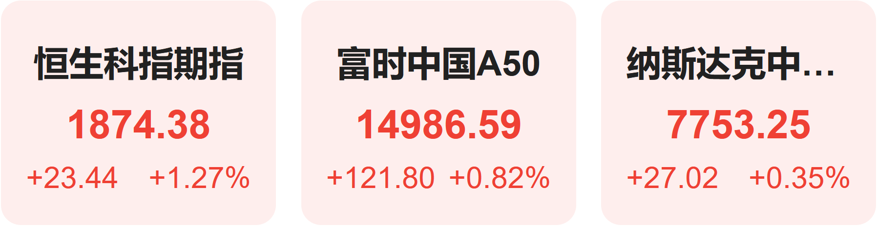 11月25日,隔夜恒生科技指数期货上涨1.27%,纳斯达克中国金龙指数上涨0.35%,富时中国A50指数上涨0.82%。
