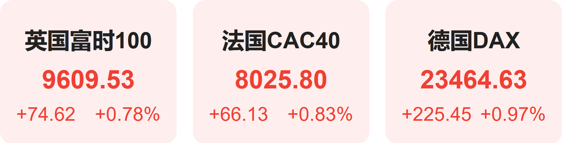 欧洲股市方面,英国富时100指数小幅上涨0.78%,报9610点。法国CAC40指数小幅上涨0.83%,报8026点。德国DAX指数小幅上涨0.97%,报23465点。