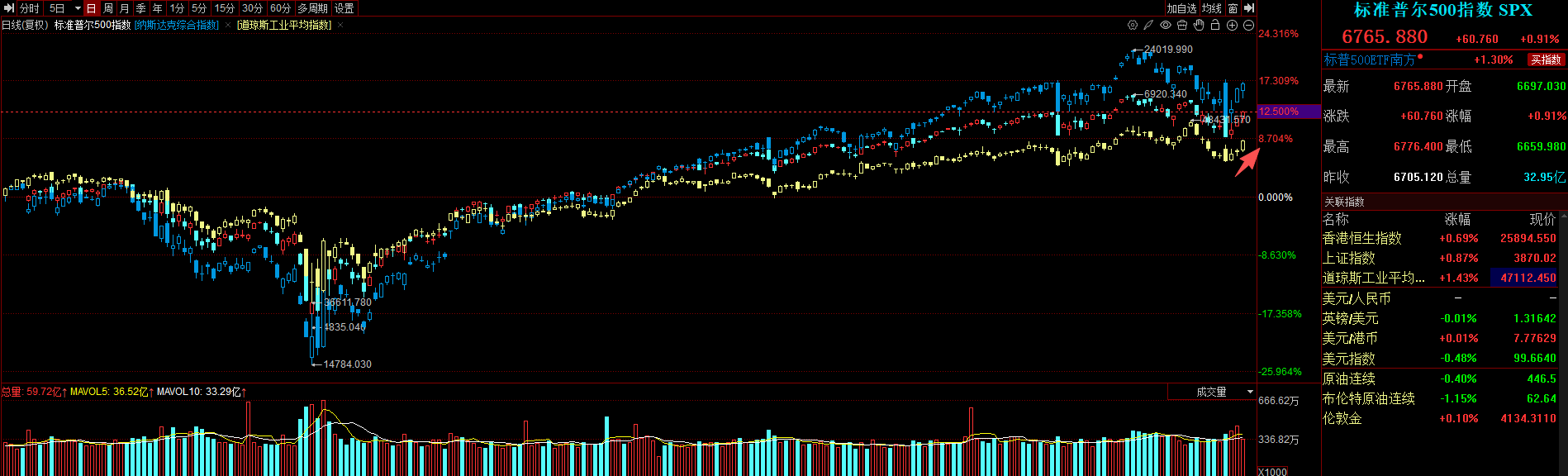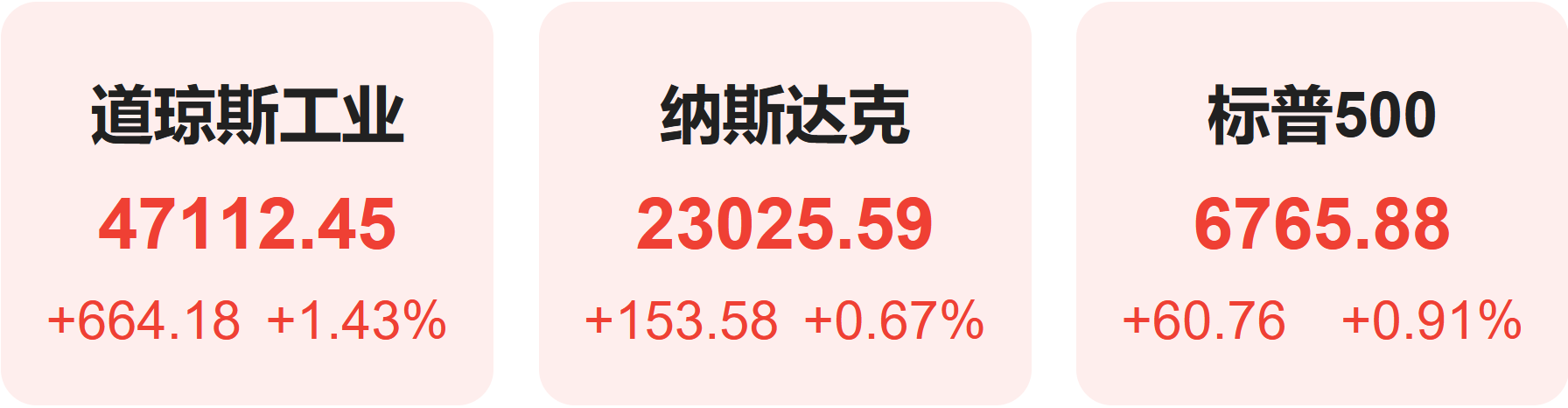 截至收盘,道琼斯指数涨1.43%,报47112.45点;标普500指数涨0.91%,报6765.88点;纳斯达克综合指数涨0.67%,报23025.59点,早盘一度跌超1.2%。