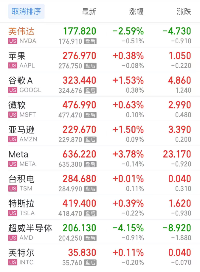 热门美股中,英伟达跌2.59%,苹果涨0.38%,谷歌C涨1.62%,谷歌A涨1.53%,微软涨0.63%,亚马逊涨1.50%,Meta涨3.78%,台积电涨0.01%,特斯拉涨0.39%,超威半导体跌4.15%,英特尔涨0.11%。