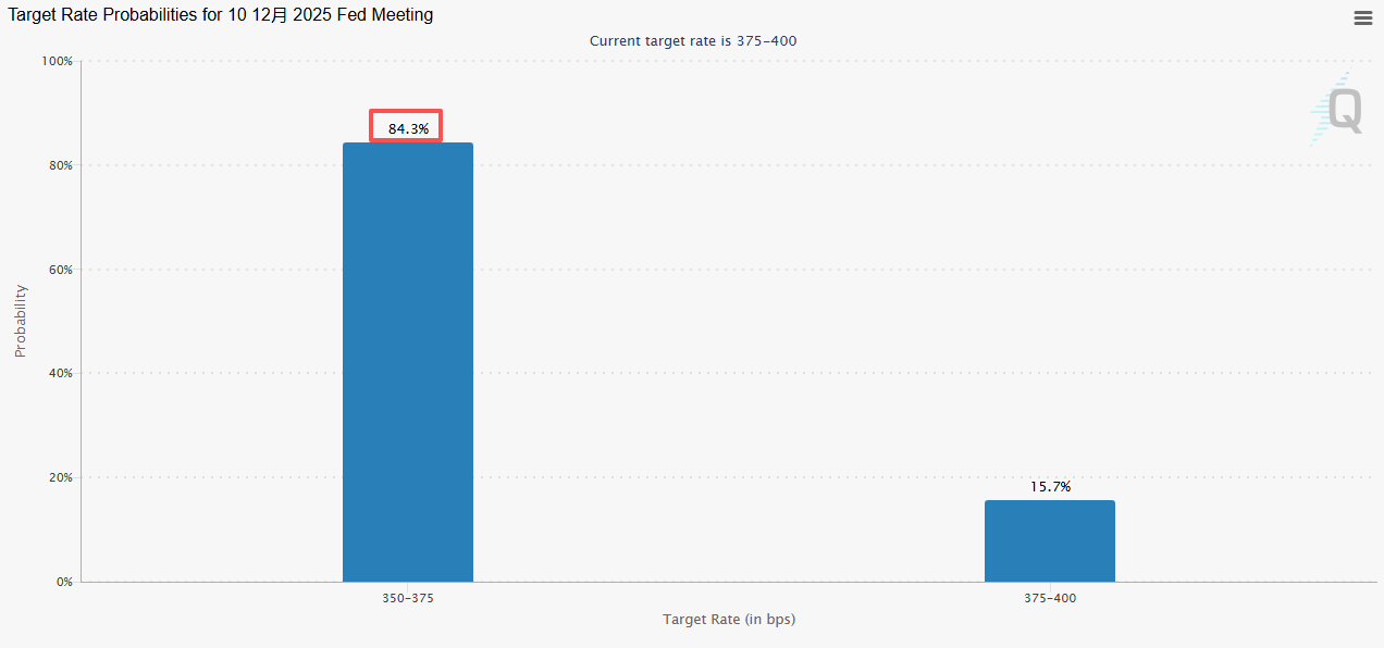 加上上周五及近期美联储官员连续释放鸽派信号,美联储下个月降息预期已经来到8成以上。CME美联储观察工具显示,12月会议上降息25个基点的概率为84.3%,进一步走高。