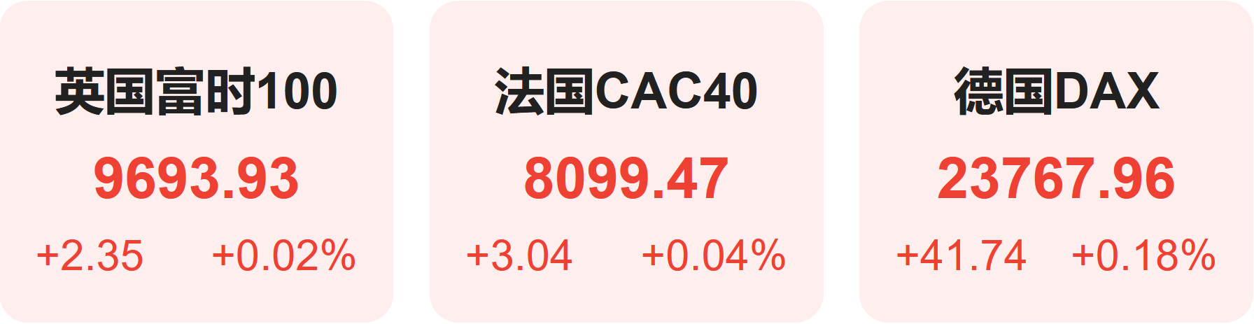 欧洲股市方面,英国富时100指数小幅上涨0.02%,报9694点。法国CAC40指数小幅上涨0.04%,报8099点。德国DAX指数小幅上涨0.18%,报23768点。