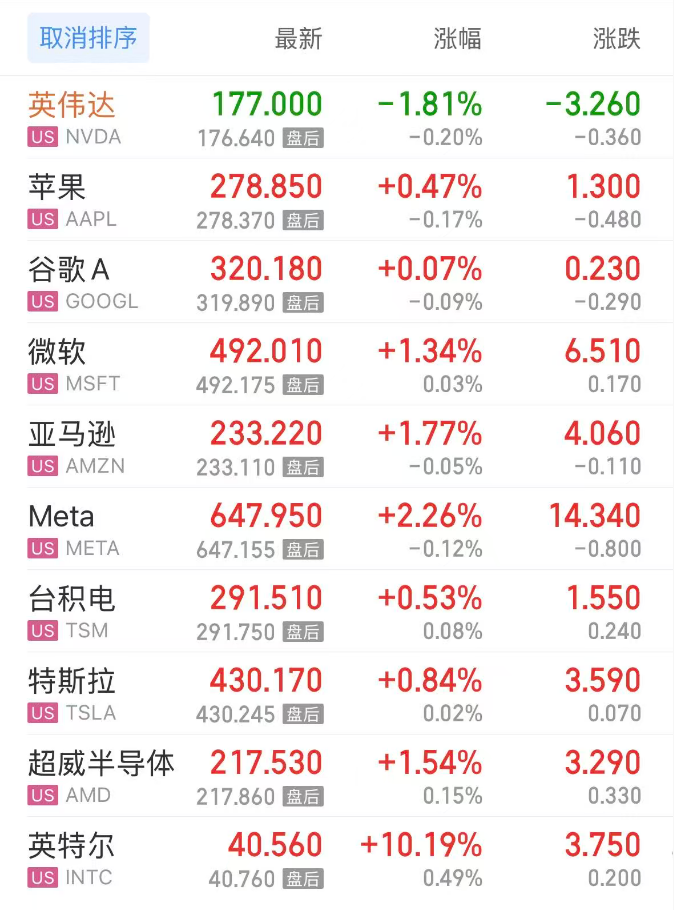 上周五,热门美股中,英伟达跌1.81%,苹果涨0.47%,谷歌A涨0.07%,谷歌C跌0.05%,微软涨1.34%,亚马逊涨1.77%,Meta涨2.26%,台积电涨0.53%,特斯拉涨0.84%,超威半导体涨1.54%,英特尔涨10.19%。