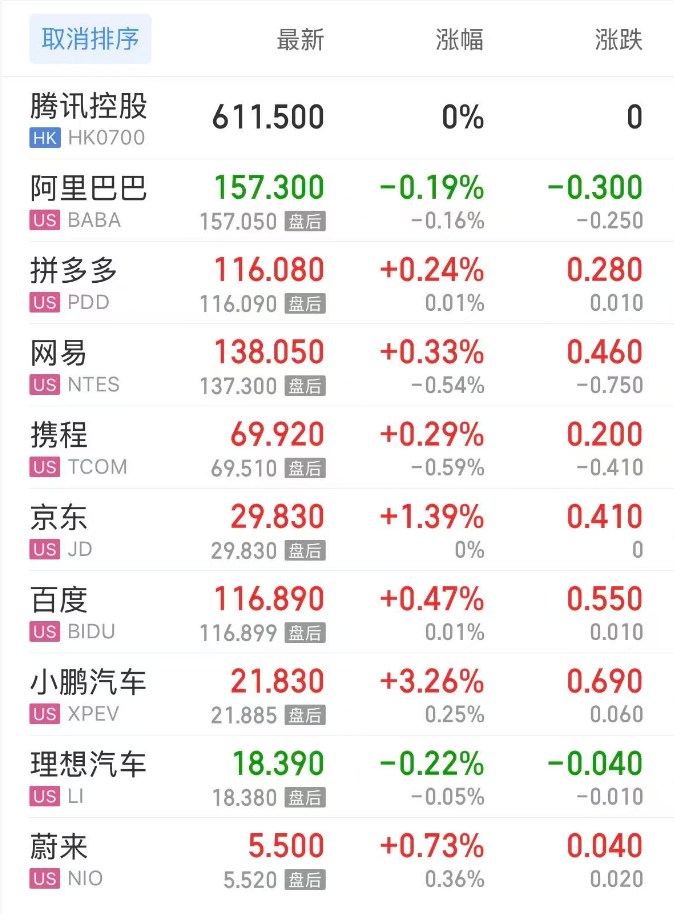 上周五,热门中概股方面,腾讯控股(港股)涨0.00%,阿里巴巴跌0.19%,拼多多涨0.24%,网易涨0.33%,携程涨0.29%,百度涨0.47%,小鹏汽车涨3.26%,理想汽车跌0.22%,蔚来涨0.73%。