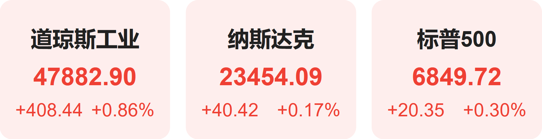 截至收盘,标普500指数涨0.30%,报6849.72点;道琼斯指数涨0.86%,报47882.90点;纳斯达克指数涨0.17%,报23454.09点。至此,标普500指数距离10月末创下的6920历史高点仅差71点,距离收盘高位只差21点。