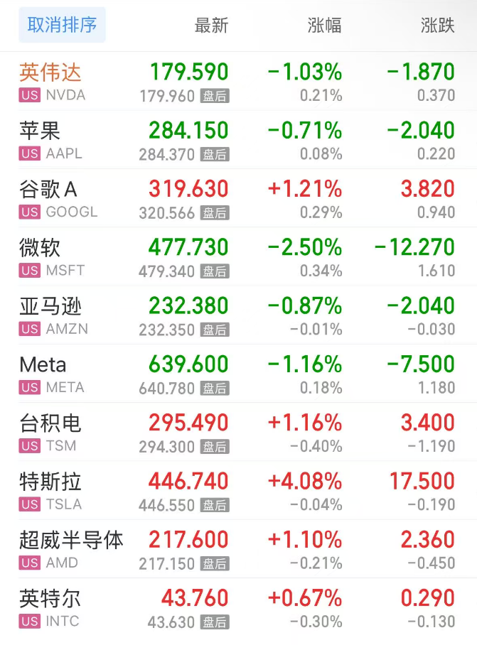 热门美股中,英伟达跌1.03%,苹果跌0.71%,谷歌C涨1.46%,谷歌A涨1.21%,微软跌2.50%,亚马逊跌0.87%,Meta跌1.16%,台积电涨1.16%,特斯拉涨4.08%,超威半导体涨1.10%,英特尔涨0.67%。