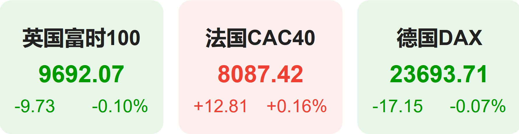 欧洲股市方面,英国富时100指数小幅下跌0.10%,报9692点。法国CAC40指数小幅上涨0.16%,报8087点。德国DAX指数小幅下跌0.07%,报23694点。