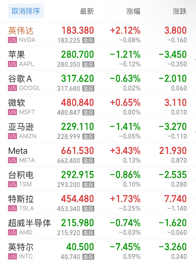 热门美股中,英伟达涨2.12%,苹果跌1.21%,谷歌C跌0.70%,谷歌A跌0.63%,微软涨0.65%,亚马逊跌1.41%,Meta涨3.43%,台积电跌0.86%,特斯拉涨1.73%,超威半导体跌0.75%,英特尔跌7.45%。