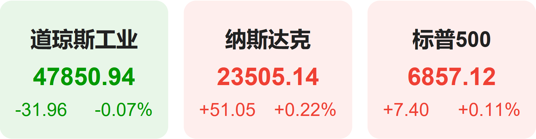 截至收盘,标普500指数涨0.11%,报6857.12点;道琼斯指数跌0.07%,报47850.94点;纳斯达克指数涨0.22%,报23505.14点。