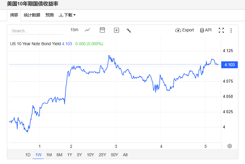 美债收益率走高,基准的10年期美债收益率最终收报4.1030%,对美联储政策利率敏感的2年期美债收益率收报3.5310%。