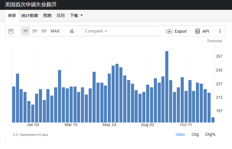 包含感恩节假期的上周,首次申请失业救济人数减少2.7万至19.1万,为2022年9月以来最低水平,而经济学家预期增至22万。上上周持续申领失业救济金人数回落至193.9万人,但仍接近2021年以来的最高水平。反映出就业市场新增裁员放缓与长期失业者再就业困难并存的局面。