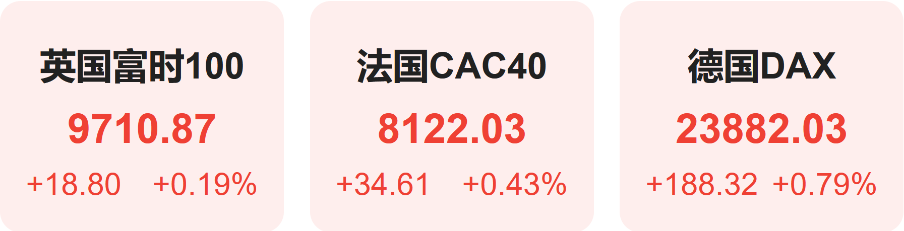 欧洲股市方面,英国富时100指数小幅上涨0.19%,报9711点。法国CAC40指数小幅上涨0.43%,报8122点。德国DAX指数小幅上涨0.79%,报23882点。
