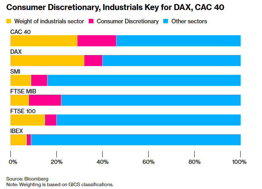 正如上述图表所显示的那样,非必需消费与工业板块是德国DAX与法国CAC40指数的关键权重支柱。