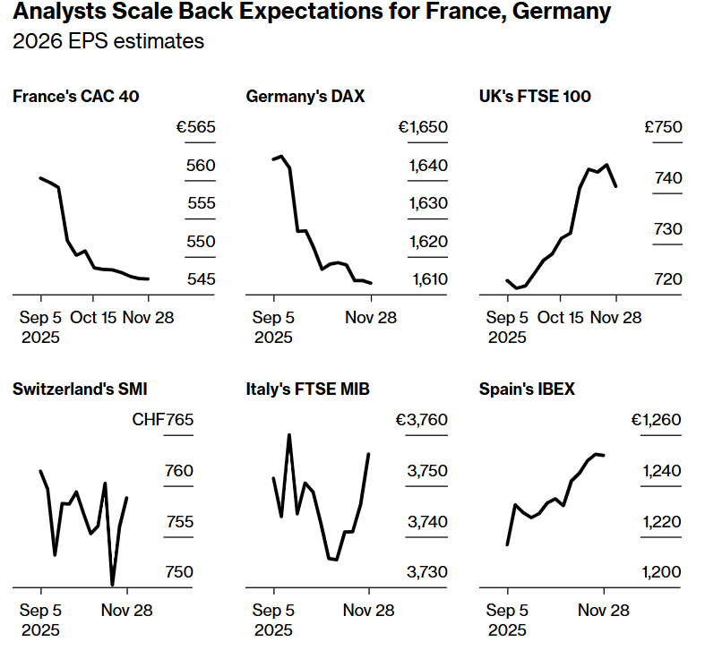 上图显示,分析师们持续下调对法国、德国的预期(基于2026年每股收益预期)。