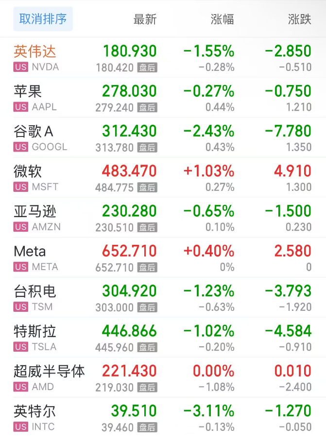 热门美股中,英伟达跌1.55%,苹果跌0.27%,谷歌C跌2.27%,谷歌A跌2.43%,微软涨1.03%,亚马逊跌0.65%,Meta涨0.40%,台积电跌1.23%,特斯拉跌1.02%,超威半导体涨0.01%,英特尔跌3.11%。