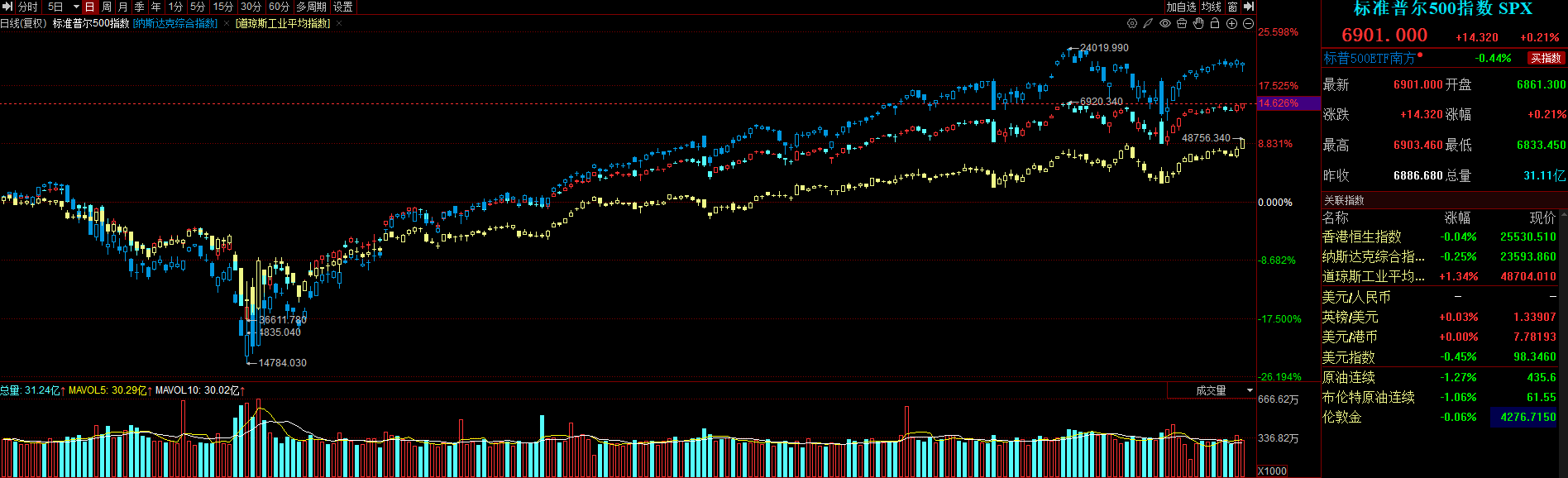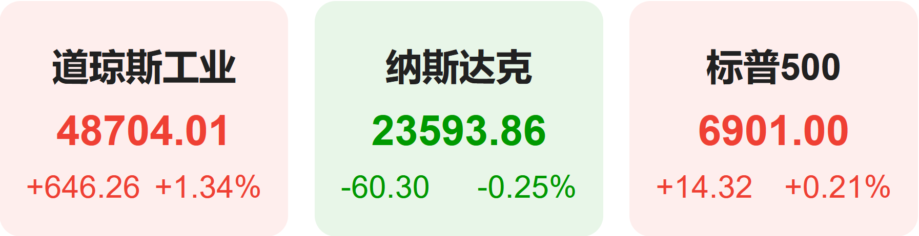 截至收盘,标普500指数涨0.21%,报6901.00点;道琼斯指数涨1.34%,报48704.01点;纳斯达克指数跌0.25%,报23593.86点。