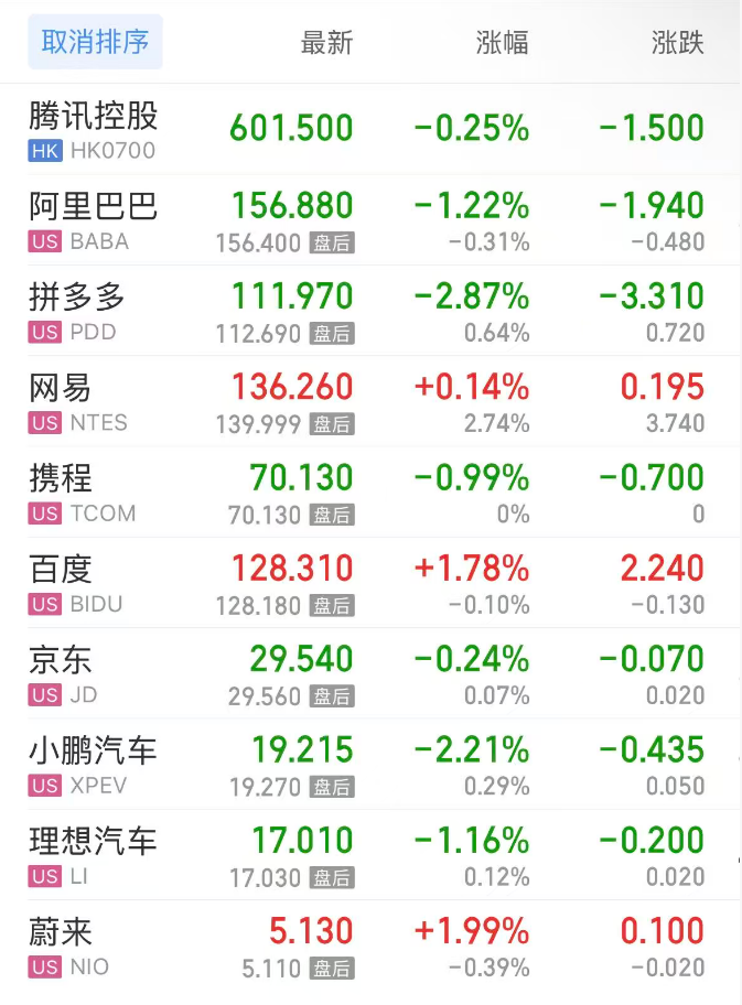 热门中概股方面,腾讯控股(港股)跌0.25%,阿里巴巴跌1.22%,拼多多跌2.87%,网易涨0.14%,携程跌0.99%,百度涨1.78%,小鹏汽车跌2.21%,理想汽车跌1.16%,蔚来涨1.99%。