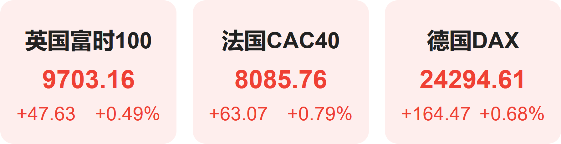 欧洲股市方面,英国富时100指数小幅上涨0.49%,报9703点。法国CAC40指数小幅上涨0.79%,报8086点。德国DAX指数小幅上涨0.68%,报24295点。