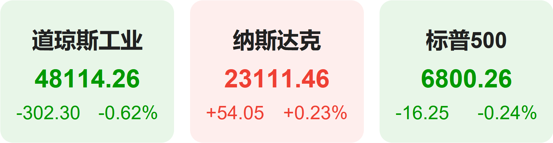 截至收盘,标普500指数跌0.24%,报6800.26点;道琼斯指数跌0.62%,报48114.26点;纳斯达克指数涨0.23%,报23111.46点。