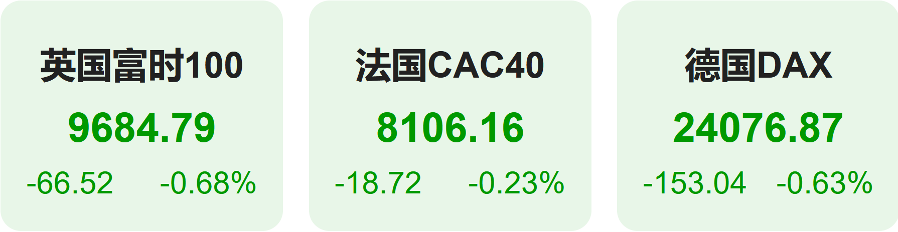 欧洲股市方面,英国富时100指数小幅下跌0.68%,报9685点。法国CAC40指数小幅下跌0.23%,报8106点。德国DAX指数小幅下跌0.63%,报24077点。