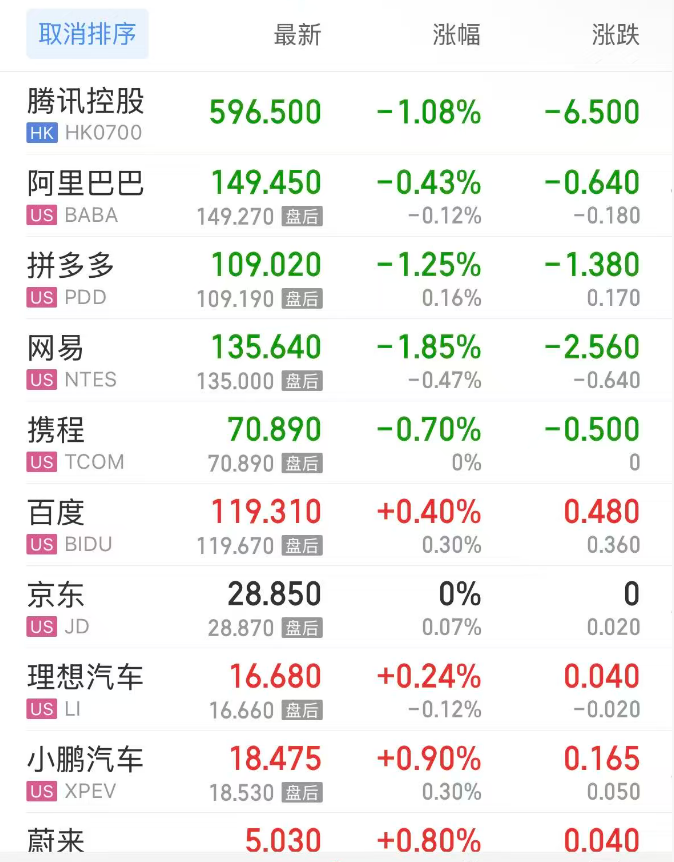 热门中概股方面,腾讯控股(港股)跌1.08%,阿里巴巴跌0.43%,拼多多跌1.25%,网易跌1.85%,携程跌0.70%,百度涨0.40%,理想汽车涨0.24%,小鹏汽车涨0.90%,蔚来涨0.80%。