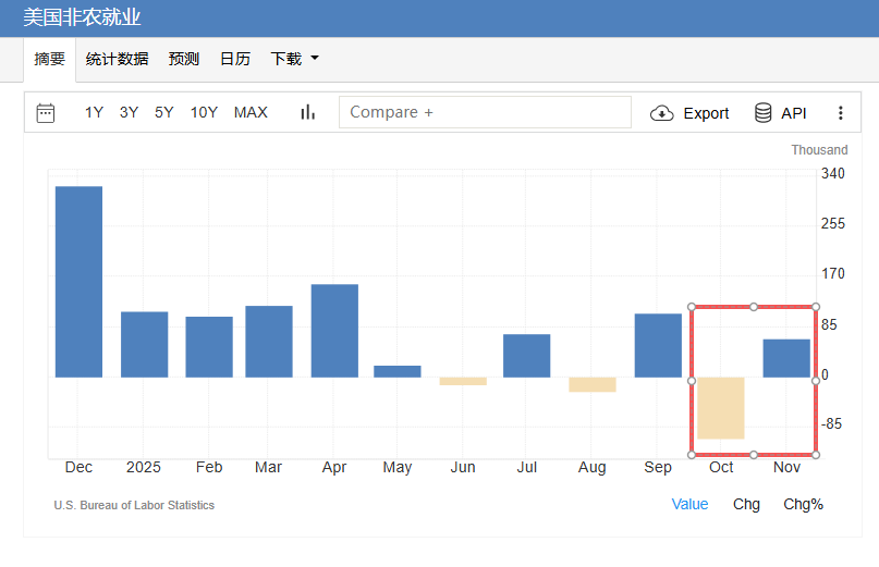 美国劳工统计局周二同时公布10月和11月非农就业数据。数据显示,11月非农就业人口增加6.4万人,略好于市场预期,但失业率意外升至4.6%,创2021年9月以来新高,显示劳动力市场持续降温。10月就业人数大幅减少10.5万人,主要受联邦政府就业骤降拖累。报告显示,就业结构明显恶化,全职岗位大幅流失、兼职和多份工作人数激增,凸显就业“质量”走弱。