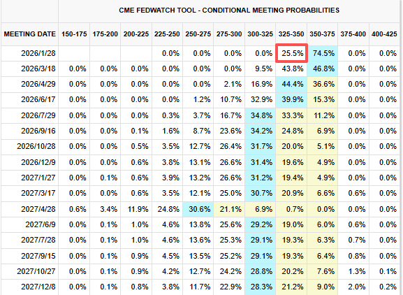 数据公布后,市场对美联储明年1月的降息预期小幅攀升后又回落,目前CME美联储观察工具显示的降息概率为25.5%。