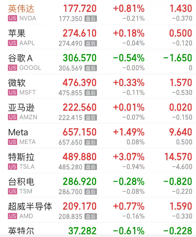 热门美股中,英伟达涨0.81%,苹果涨0.18%,谷歌C跌0.51%,谷歌A跌0.54%,微软涨0.33%,亚马逊涨0.01%,Meta涨1.49%,特斯拉涨3.07%,台积电跌0.29%,超威半导体涨0.77%,英特尔跌0.61%。