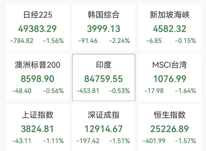 12月16日,亚太主要股指延续跌势,日经225指数收跌超1%,韩国KOSPI指数收跌超2%,A股三大指数集体飘绿,港股午后跌幅进一步扩大;黄金白银盘中跳水,现货铂金逆势飘红;人民币持续升值。