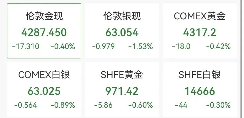 国际贵金属方面,黄金白银冲高跳水,COMEX黄金期货目前在4310美元/盎司附近震荡调整,白银大跌超1%,现货铂金逆势飘红,截至发稿涨超1%。
