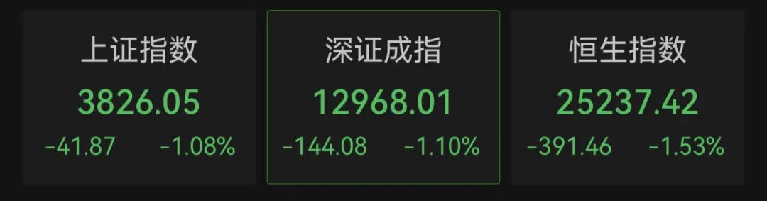 A股、港股也大跌,截至发稿,上证指数下跌1.08%,深证成指下跌1.10%,恒生指数下跌1.53%。此外,富时中国A50指数期货也跌超1%。