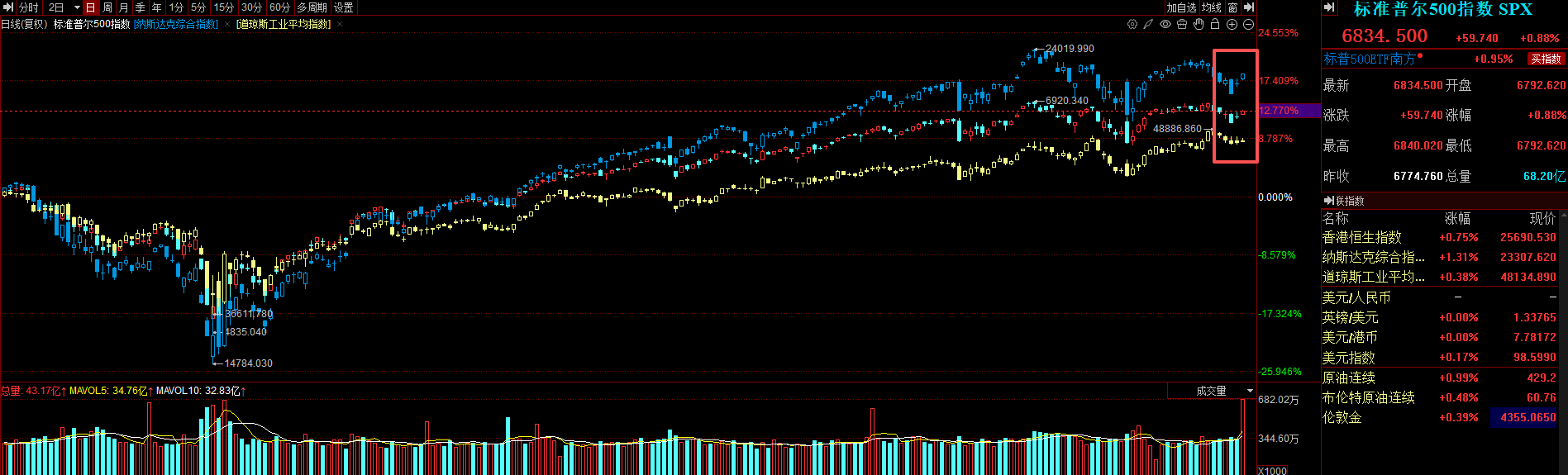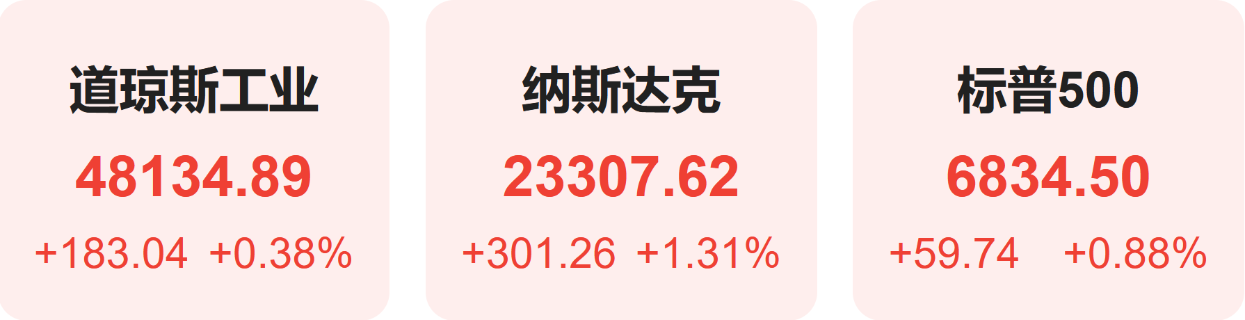 截至上周五收盘,标普500指数涨0.88%,报6834.50点;道琼斯指数涨0.38%,报48134.89点;纳斯达克指数涨1.31%,报23307.62点。