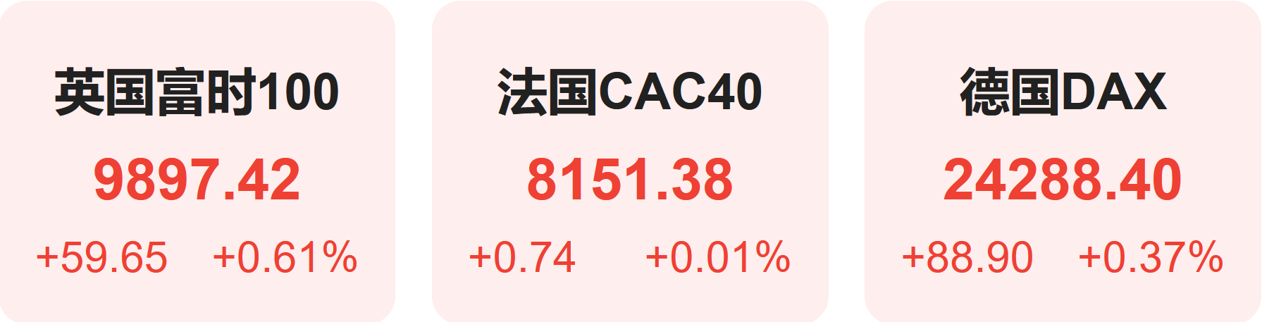 上周五,欧洲股市方面,英国富时100指数小幅上涨0.61%,报9897点。法国CAC40指数小幅上涨0.01%,报8151点。德国DAX指数小幅上涨0.37%,报24288点。