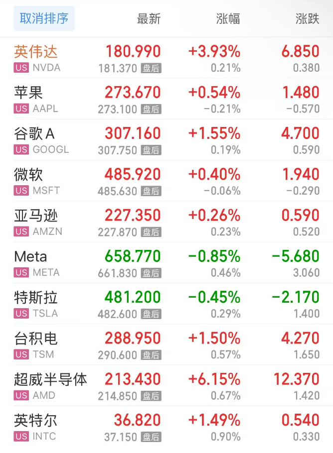 热门美股中,英伟达涨3.93%,苹果涨0.54%,谷歌C涨1.60%,谷歌A涨1.55%,微软涨0.40%,亚马逊涨0.26%,Meta跌0.85%,特斯拉跌0.45%,台积电涨1.50%,超威半导体涨6.15%,英特尔涨1.49%。