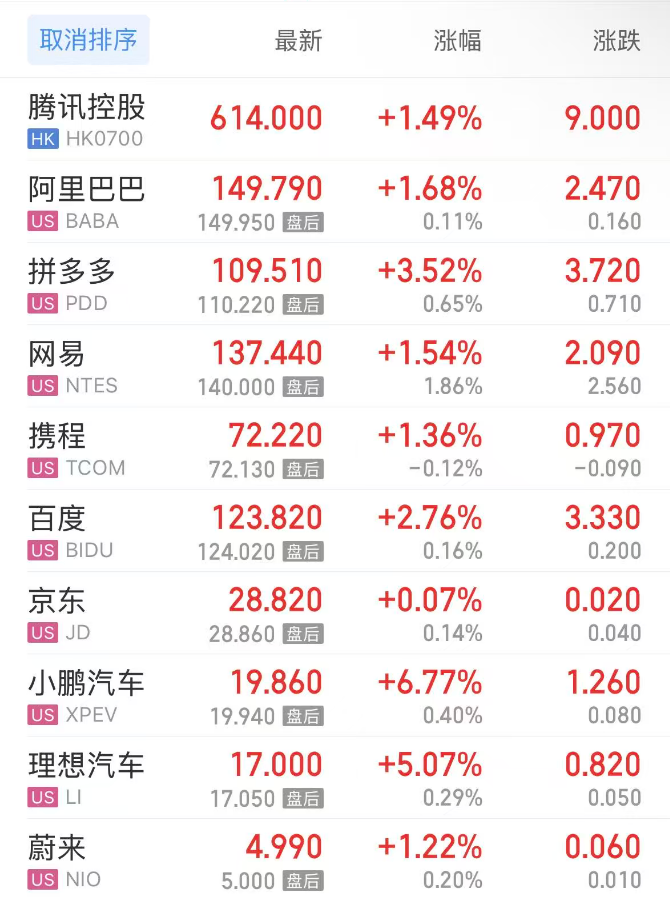 热门中概股方面,腾讯控股(港股)涨1.49%,阿里巴巴涨1.68%,拼多多涨3.52%,网易涨1.54%,携程涨1.36%,百度涨2.76%,小鹏汽车涨6.77%,理想汽车涨5.07%,蔚来涨1.22%。