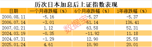 据证券时报.数据宝统计,进入2000年以来,日本已加息六次,分别是:
