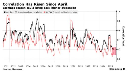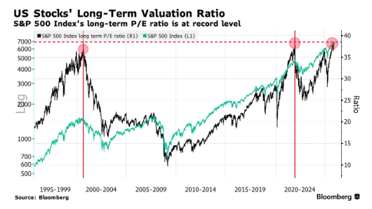 在科技股的带动下,标普500指数的远期估值比率已触及历史峰值。这一指标不仅突破了此前的关键高点,而且历史上这些高点往往是大级别回调的前兆——例如2000年互联网泡沫破裂前夕的夏季,以及2022年1月市场开始计价利率大幅上行的节点。