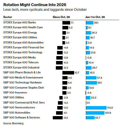 这一板块轮动现象在欧美市场同步上演,只是具体轮动路径存在区域差异。板块轮动有助于拓宽市场上涨的基础,推动资金向顺周期板块、防御性资产以及此前滞涨的板块分流。