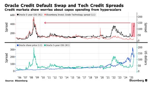 随着估值飙升,市场关于“泡沫”的讨论日益升温,其中科技板块与AI概念股成为此次担忧的焦点。头部云服务厂商不断加码资本开支,其规模已逼近资产负债表的承受上限。尽管当前这一问题尚未蔓延至整个市场,但债券市场的“监督者”已蓄势待发。此前甲骨文(ORCL.US)业绩不及预期引发股价暴跌,其信用违约互换价格同步飙升至历史新高,就是最直接的例证。.