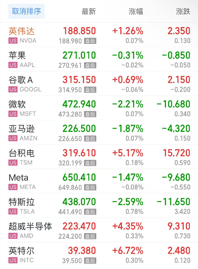 上周五热门美股中,英伟达涨1.26%,苹果跌0.31%,谷歌C涨0.48%,谷歌A涨0.69%,微软跌2.21%,亚马逊跌1.87%,台积电涨5.17%,Meta跌1.47%,特斯拉跌2.59%,超威半导体涨4.35%,英特尔涨6.72%。