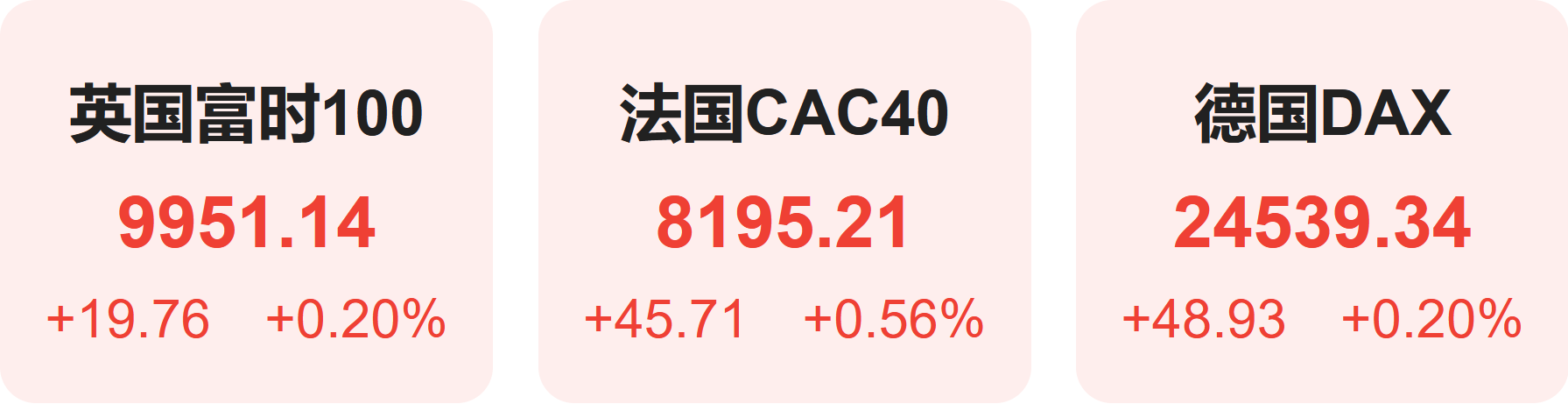 上周五欧洲股市方面,英国富时100指数小幅上涨0.20%,报9951点。法国CAC40指数小幅上涨0.56%,报8195点。德国DAX指数小幅上涨0.20%,报24539点。
