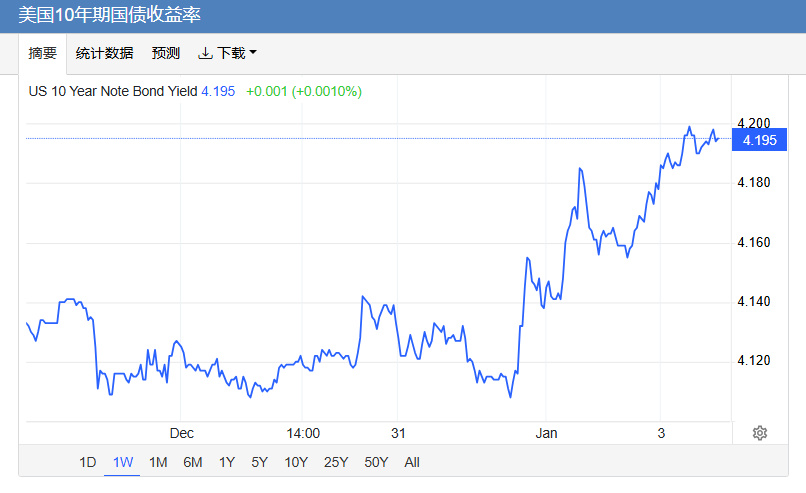 上周五,美债收益率普涨,基准的10年期美债收益率最终收报4.195%,对美联储政策利率敏感的2年期美债收益率收报3.488%。